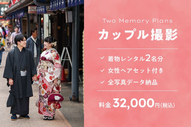 2名分の着物レンタル一式に、女性のヘアセットがついたお得なプランです。